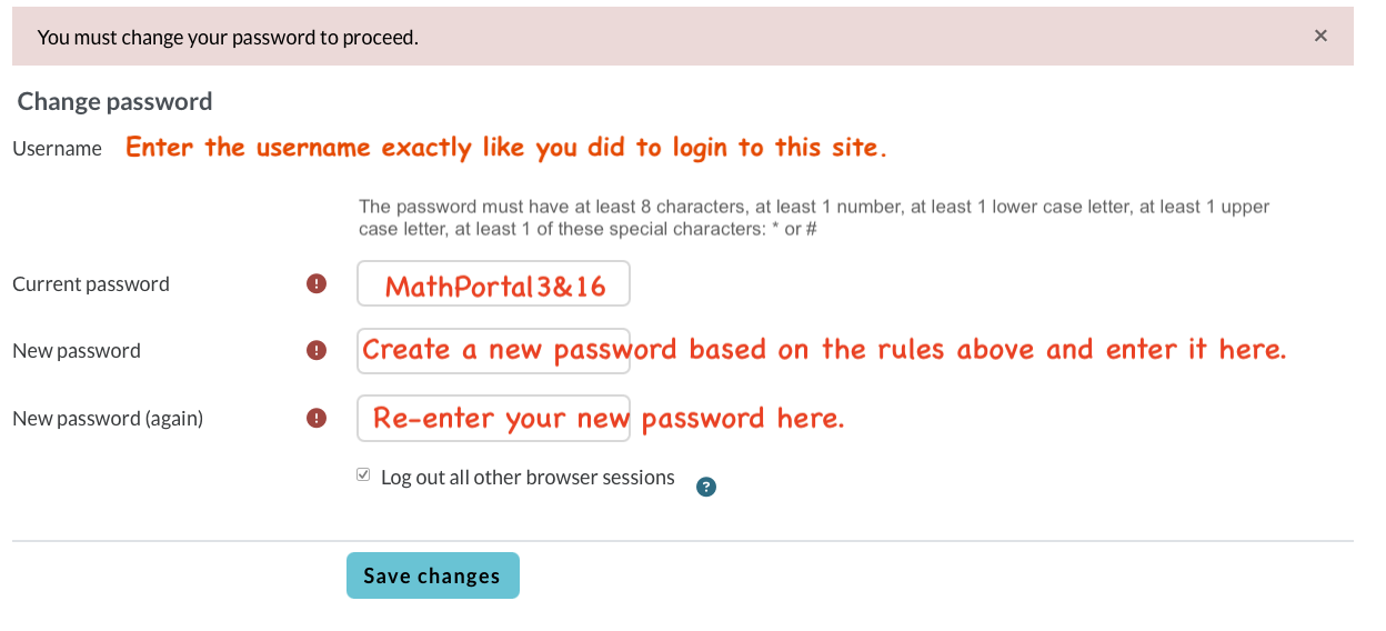 - A “Change Password” screen will be displayed (see below). Enter the information EXACTLY like the screenshot below.